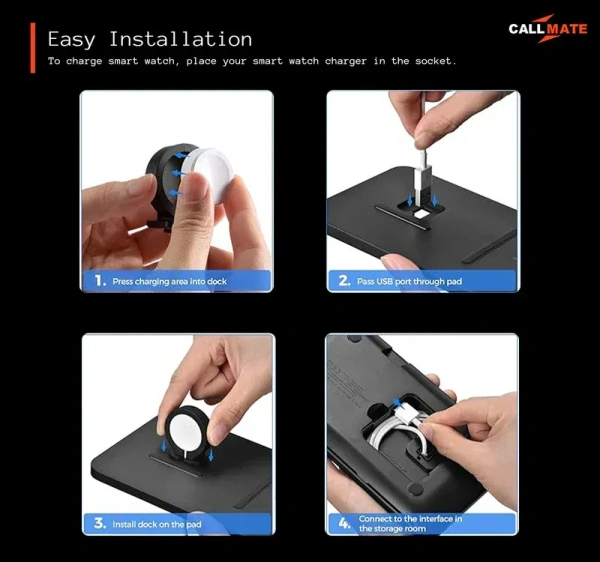 Introducing the CALLMATE 2 in 1 Wireless Charger Pad the ultimate solution for streamlined charging of your iPhone and Apple Watch. Designed with convenience and efficiency in mind, this sleek charger pad is a must have addition to your nightstand or workspace. Say goodbye to tangled cables and cluttered surfaces! With the CALLMATE 2 in 1 Wireless Charger Pad, you can effortlessly charge your iPhone and Apple Watch simultaneously, reducing cable mess and maximizing space. Equipped with fast charging technology, this charger pad delivers a quick power boost to your devices, ensuring they're ready to go when you are. Plus, its case friendly design means you can charge your devices without having to remove their protective cases. Not just a charger, but also a storage solution! The CALLMATE 2 in 1 Wireless Charger Pad features a hidden compartment for neatly storing your magnetic charging cable, keeping it organized and out of sight when not in use. With its nightstand mode, this charger pad seamlessly blends into your bedroom decor while providing easy access to your devices throughout the night. The LED indicator keeps you informed of the charging status, so you can always stay connected. Upgrade your charging experience with the CALLMATE 2 in 1 Wireless Charger Pad the perfect combination of style, functionality, and efficiency.