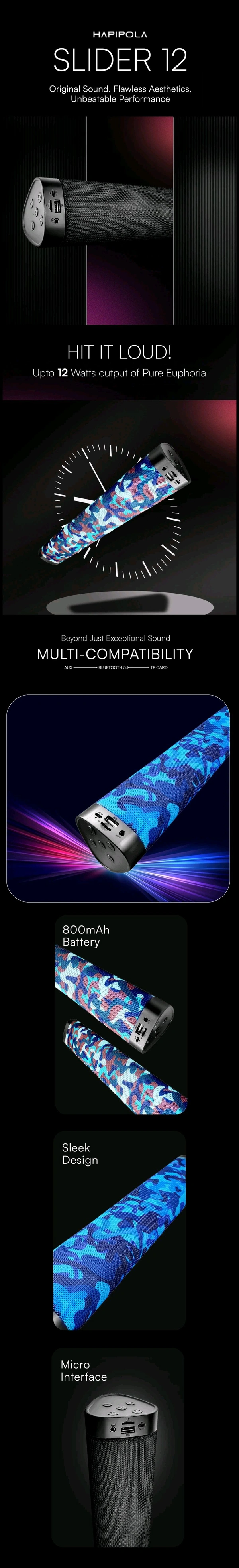 - Slider 12: 6 Hours Playback, 12 Watt Output, 5.1 Bluetooth, AUX Input, USB Input TF Card Input, 1500mAh Battery, Upto 10M Range, Micro Interface, Hands-free Calls, TWS Pairing, FM Radio